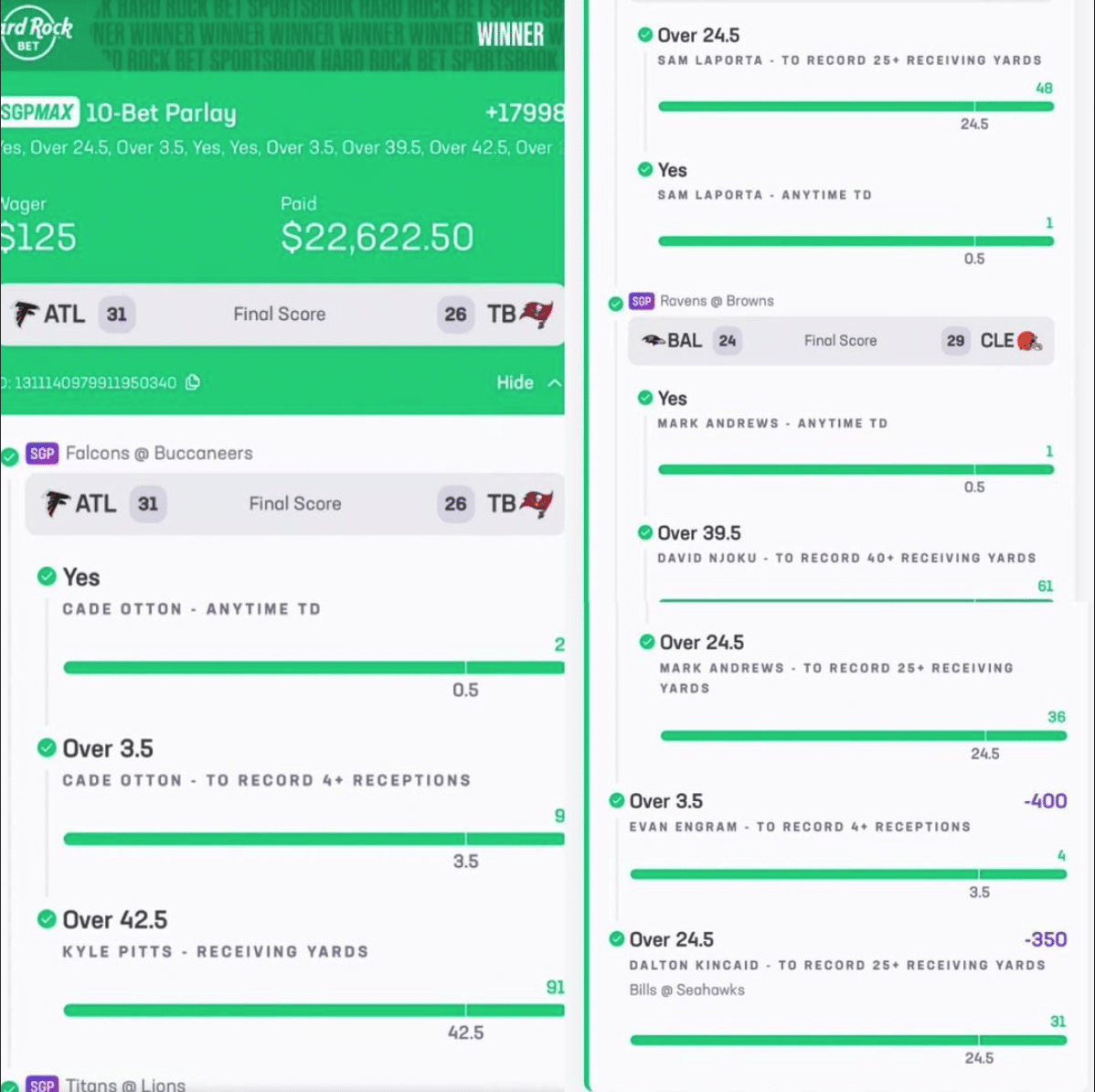 This sensational 10-Bet tight end parlay made full use of the extensive catalog of available bets on Hard Rock Bet. Mixing together anytime TD bets along with an assortment of props including reception and yardage overs, the +17998 parlay hit turning the $125 stake into a tantalizing $22,622.50.