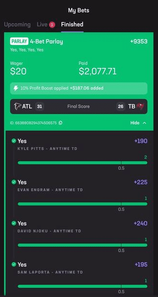 Our list begins with a 4-Bet anytime TD parlay, all in the early 1pm window, that struck gold. With odds of +9353, or roughly 93-1, this Hard Rock Bet bettor turned his $20 wager into $2,077.71 after Evan Engram hauled in a 14 yard touchdown reception with just 1:48 remaining in the fourth quarter, checking off the last wager on the ticket. Notably, a profit boost was applied to make the win 10% sweeter.