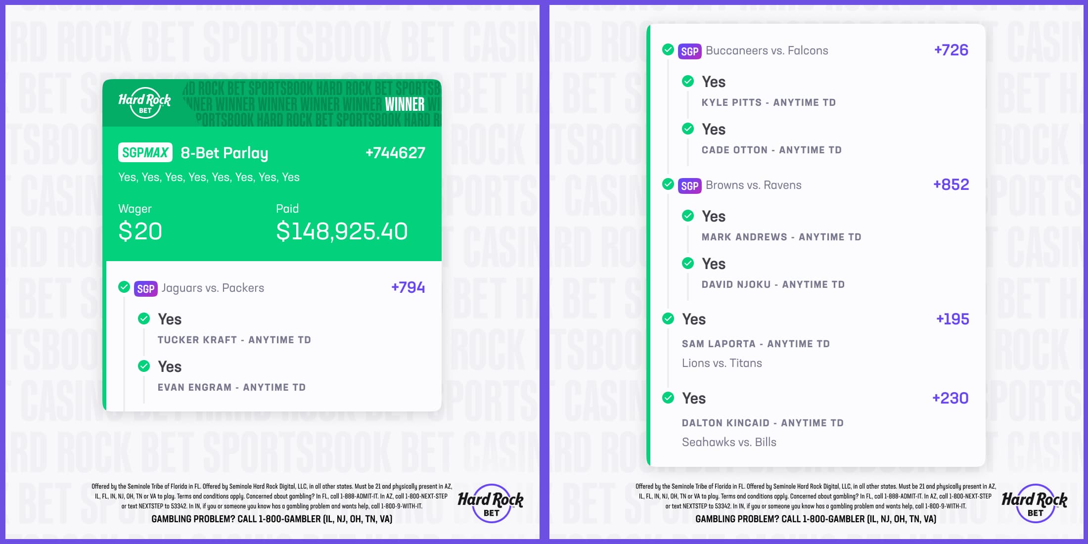 The largest hit of the day belonged to a Hard Rock Bet player who placed a jaw-dropping $20, 8-Bet parlay on a collection of touchdown-hungry tight ends. With odds of +744627, or 7,446-1, the bet paid out a remarkable $148,925.40. Seven of the eight wagers hit during the first wave of games, with Dalton Kincaid securing the enormous score against the Seahawks after connecting with Josh Allen.