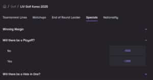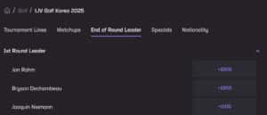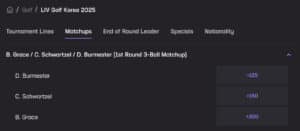 The screenshot below showcases a three-way head-to-head matchup during a LIV Golf event in Korea. In this case, the market will be graded based on the results of the 1st Round and involves three golfers rather than two. By the end of the 1st round, the golfer with the lowest score amongst those three options will win the bet.